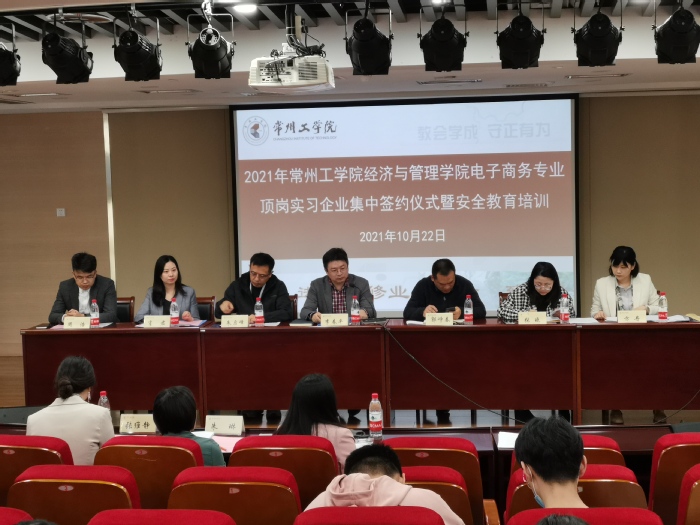 为了更好地培养应用型、创新型人才,实现在校期间与单位职业岗位的零距离接触,培养员工综合管理能力和电子商务技术运用能力,从而强化员工的创新意识,增强职业竞争能力,提高员工的综合职业素质。10月22日下午,公司举办“电子商务专业顶岗实习集中签约仪式暨安全教育培训”。公司党委副书记郭峥春、副经理李春平、电子商务系主任方丹、江苏立卓信息技术有限公司运营总监张维静、综合管理部经理肖君、培训主管严蔚雯,常州青鸟文化旅游发展有限公司总经理朱启峰、副总经理朱琳,常州诗唯雅电子商务有限公司运营主管周浩,常州小飞猪网络科技有限公司人事经理张晓以及电子商务专业员工参加签约仪式,签约仪式由顶岗实习带队老师解蕙主持。