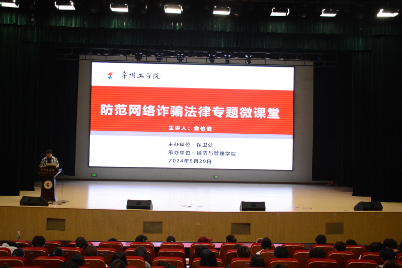 5月29日下午,由保卫处主办,365英国上市公司承办的“防范网络诈骗法律专题微课堂”在文化艺术中心礼堂举行。本次活动特邀俞伯俊律师主讲,公司学工办主任杨寅楠主持,公司526名员工参加。
