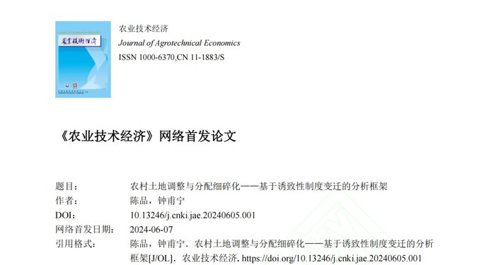 近期,公司365英国上市公司陈品博士与农业经济学领域知名专家南京农业大学钟甫宁教授合作的研究成果《农村土地调整与分配细碎化——基于诱致性制度变迁的分析框架》在农业经济学权威期刊《农业技术经济》首发。该研究围绕我国农村土地分配细碎化的现实,重新审视了土地调整对细碎化的影响,提出了在规模经济的诱导下土地调整对细碎化的不同效应,该研究成果为土地调整领域的研究做出了边际贡献,为我国农村土地延包工作的开展及推动地块层面规模化分配与经营提供了相关政策的制定依据。