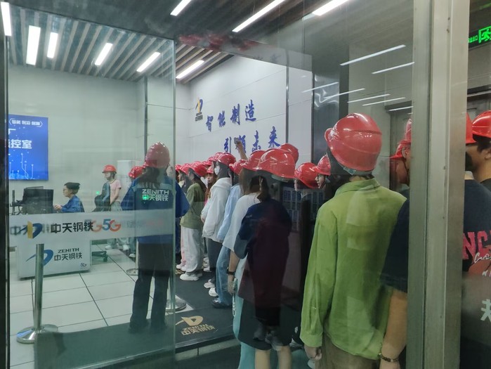 在集团专业人员引导下,师生们深入智能管控中心与轧钢车间一线,近距离观摩高度自动化的生产调度系统与精益化现场管理流程。中天钢铁将“工业大脑”与绿色理念深度耦合的实践令师生印象深刻——从原料入场到成品出厂的全链条数字化管控、花园式厂区环境、以及高水循环利用率的先进技术,生动诠释了传统产业向高端化、智能化、绿色化跃升的“中天样本”。