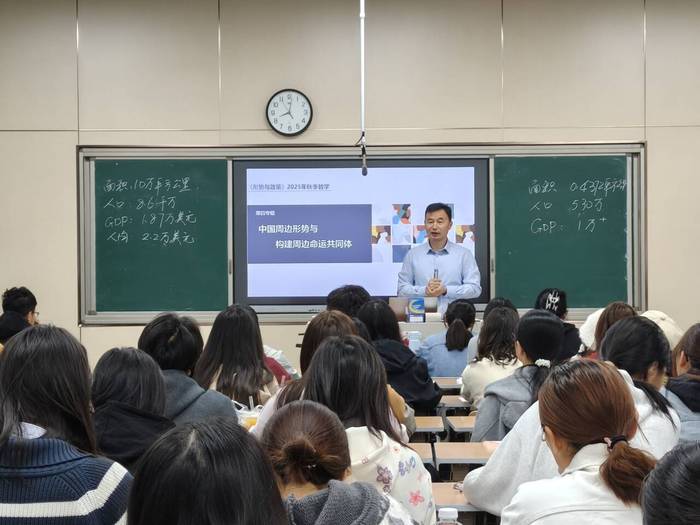 “形势与政策”课是目前高校本科阶段以习近平新时代中国特色社会主义思想为核心内容的思政必修课之一。本节课刘春节以周边政治时事和中国外交态度为切入点,围绕新时代中国周边工作新成就与新形势展开,他系统阐述了我国在政治互信、经贸发展、安全合作、人文交流、区域治理等领域的亮眼成果,将宏观政策与青年责任紧密结合。