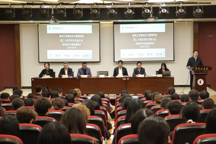 大会在庄严的国歌声中拉开帷幕。首先,戴一轩代表校员工会致贺词,她充分肯定了经济与管理学员工会近年来的工作,并期望校院两级员工会后续加强合作,携手提升服务广大同学的质量与效能。随后,公司党委书记谢金楼代表公司党委对大会的召开表示热烈祝贺,他由衷感谢员工骨干们的辛勤努力。结合刚刚闭幕的党的二十届四中全会精神,谢金楼向全体员工代表和青年员工提出三点期望:一是坚定理想信念,争做有方向的奋进者;二是坚持服务同学,争做有温度的担当者;三是勇于开拓创新,争做有作为的引领者。