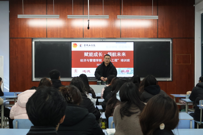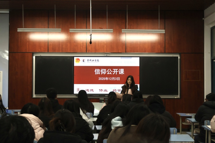 活动伊始,23贸一史育乔以《匠造引擎 —— 驱动教育巨轮的时代潮声》为题讲授信仰公开课,以工匠精神为主题,生动展现了经管学子将个人理想融入国家发展、将专业所学转化为担当作为的青春追求,引发在场学员的强烈共鸣。